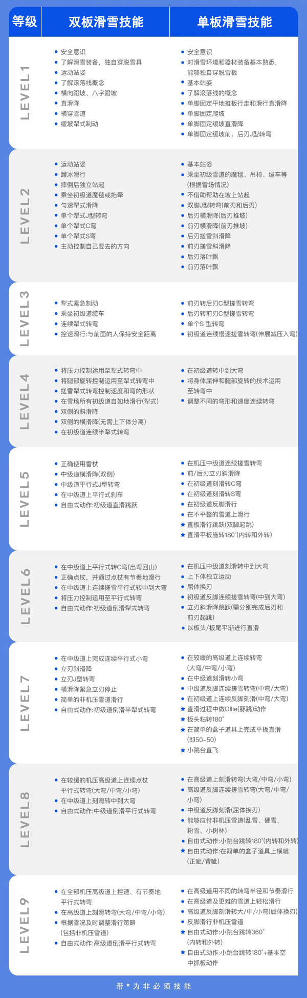 01 专属教学体系 System结合全球各大滑雪体系,以「北京大众滑雪锻炼等级标准」为总纲,打磨出了更适合中国青少年体制的1-9级进阶式教学体系,高效培养滑雪技能,专业学习考核。